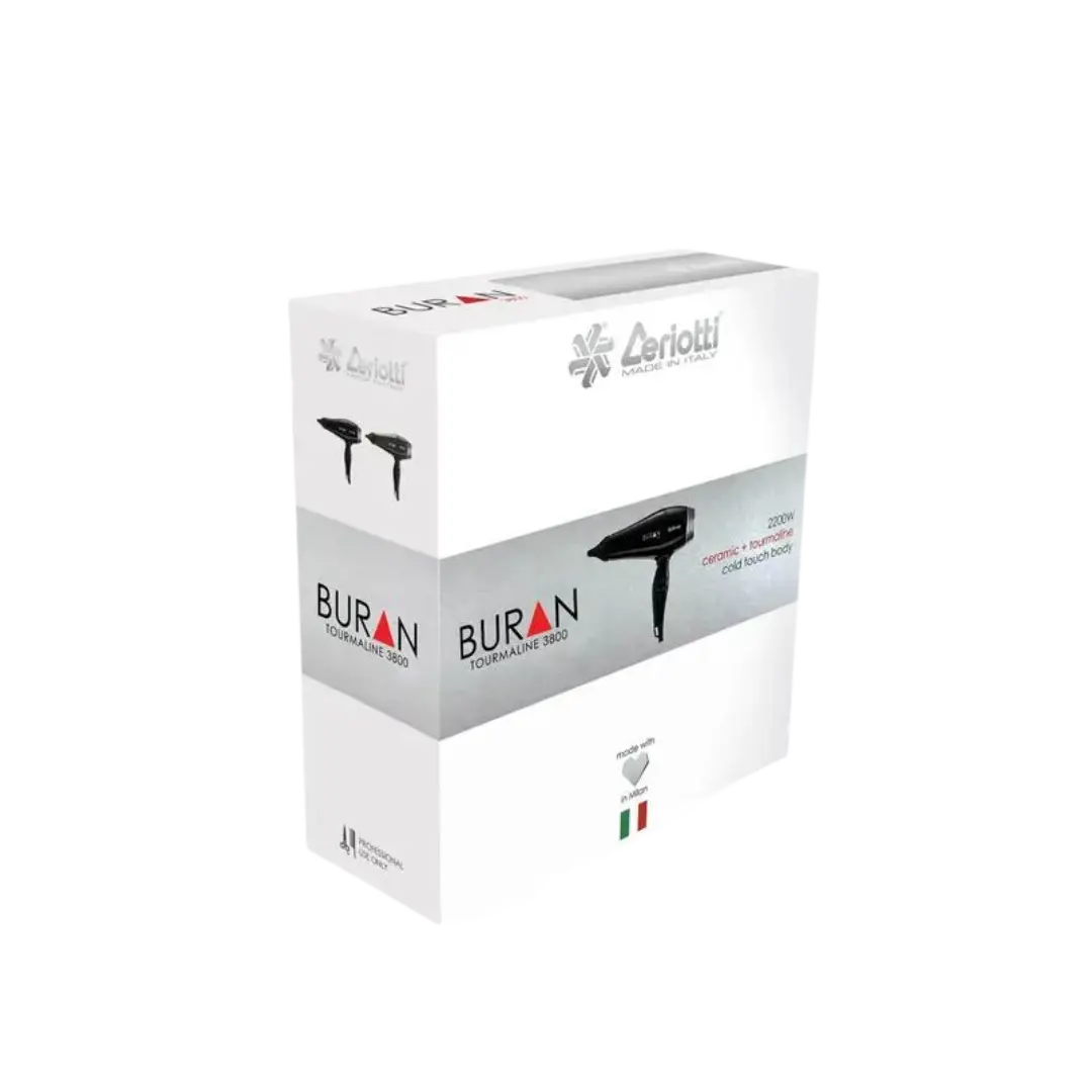 Ceriotti Buran 3800 – profesionalus itališkas plaukų džiovintuvas, sukurtas intensyviam saloniniam darbui ir reikliems namų vartotojams. Modelis pasižymi galinga 1900–2200 W galia, todėl užtikrina stiprų ir tolygų oro srautą, leidžiantį greitai išdžiovinti net ir tankius ar ilgesnius plaukus. Klasikinė juoda spalva (black colour) suteikia prietaisui modernų ir profesionalų įvaizdį.