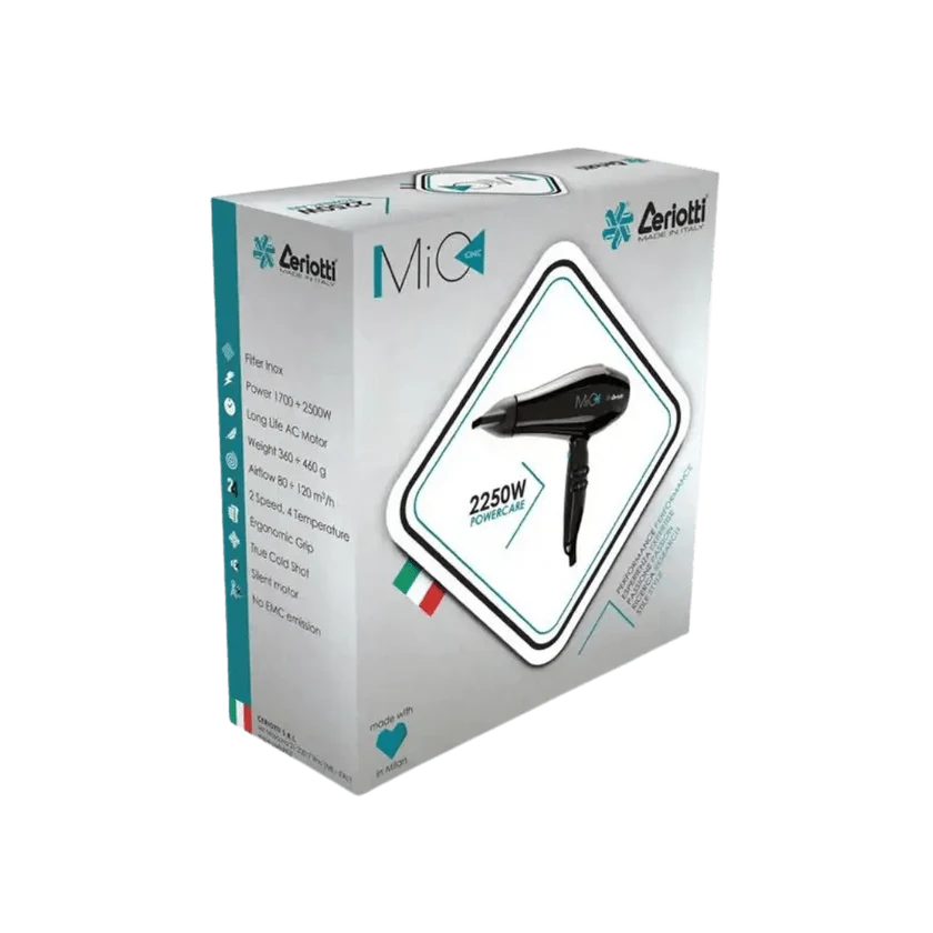 Ceriotti Mio – Italijoje pagamintas, profesionalams sukurtas plaukų džiovintuvas, išsiskiriantis kompaktiška forma, patogiu valdymu ir patikima konstrukcija. Juodos spalvos modelis pasižymi 1920–2250 W galia, todėl užtikrina greitą ir tolygų džiovinimą tiek salone, tiek namuose. Ergonomiška rankena ir vos 460 g svoris leidžia patogiai dirbti net ilgą laiką, o tyliai veikiantis variklis prailgina įrenginio naudojimo laiką.