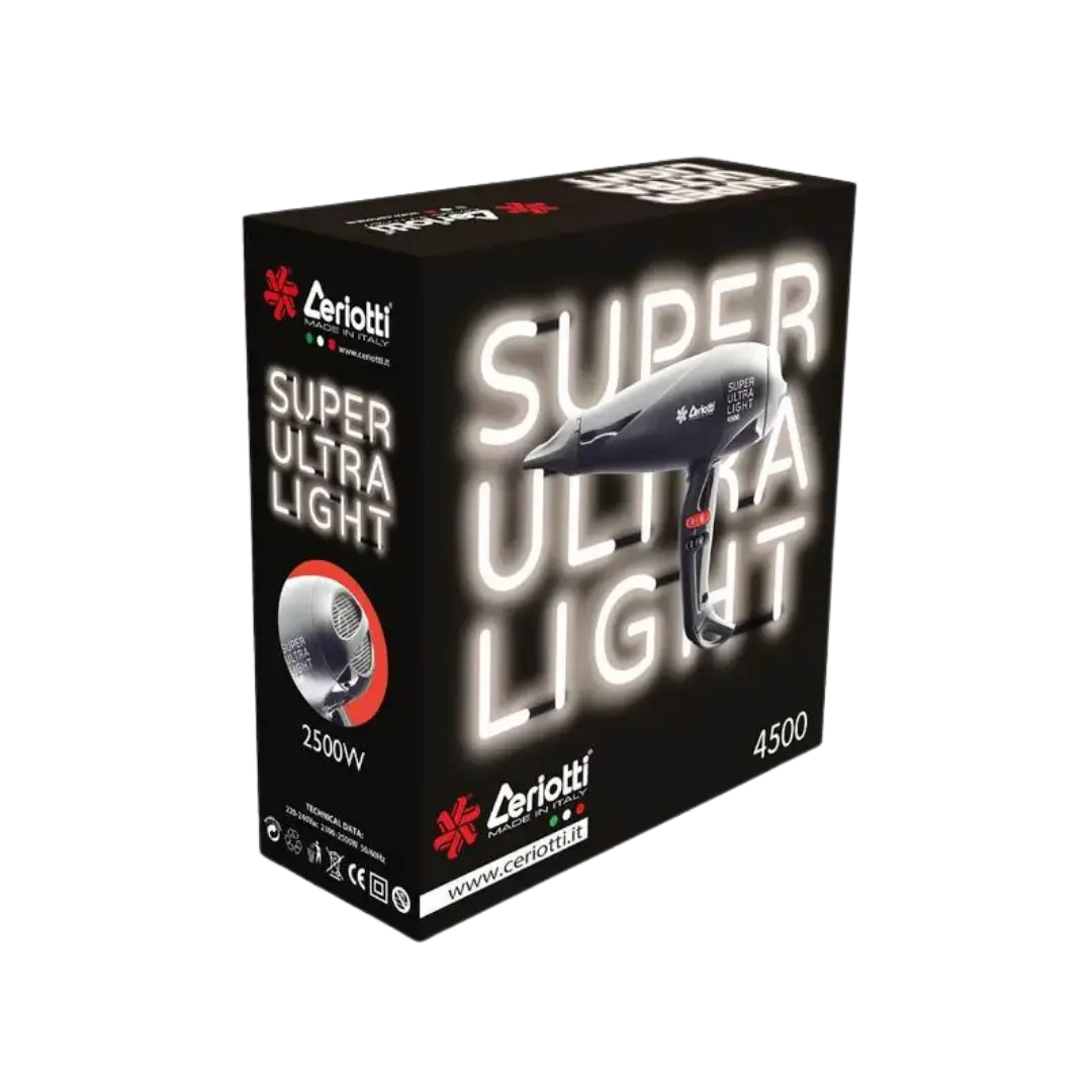 Dėl savo savybių — galingos galios, lengvumo, universalumo ir profesionalių funkcijų — Ceriotti Super Ultra Light 4500 yra puikus pasirinkimas tiems, kurie nori greito, efektyvaus ir saugaus plaukų džiovinimo.
