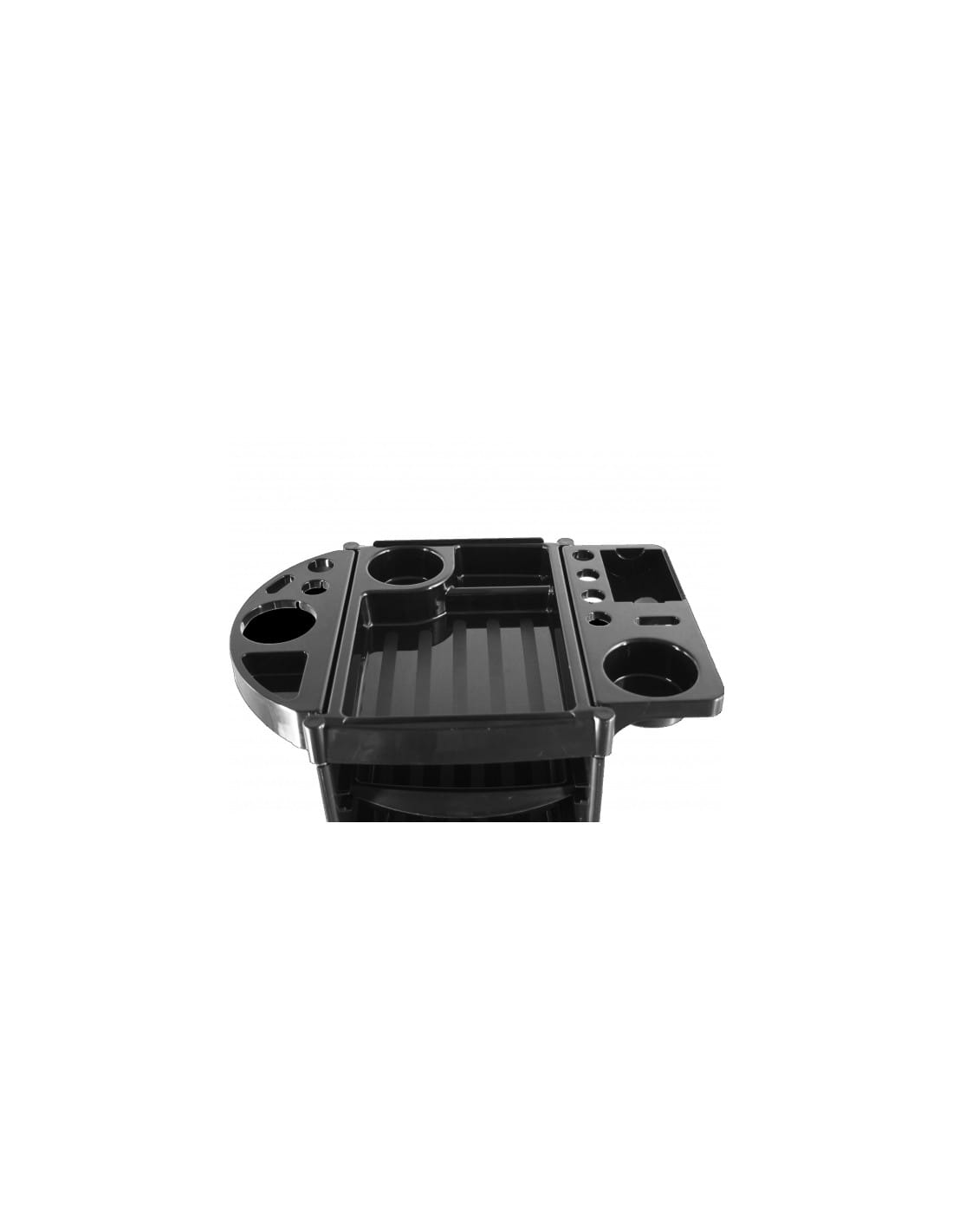 Vežimėlis turi net 5 talpius stalčius, leidžiančius patogiai susidėlioti kirpimo mašinėles, šepečius, šukas, kosmetiką ir kitus darbo įrankius. Dvi sulankstomos šoninės lentynos suteikia papildomos vietos plaukų džiovintuvui ar dažymo priemonėms, o prireikus jas galima lengvai nulenkti.
