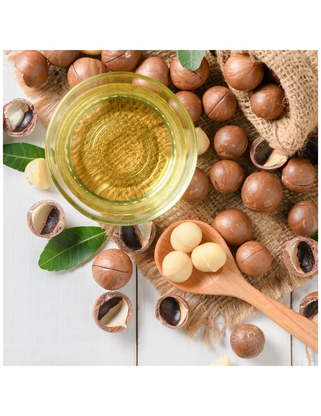 • Makadamijų aliejus – turtingas omega 3, 6, 7 ir 9 riebalų rūgštimis, suteikia plaukams žvilgesio ir saugo nuo lūžinėjimo.